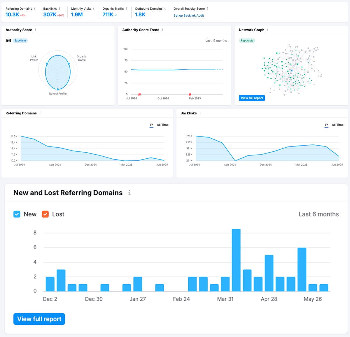 Backlink profile analysis — via Ahrefs or SEMrush, we assess the quality, quantity, and relevance of referring domains to identify strengths and gaps.