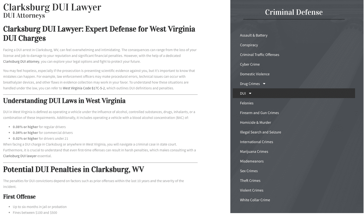 We have experience with virtually every criminal defense niche—DUI/DWI, drug crimes, traffic violations, juvenile defense, white-collar defense, and more. Our keyword research and content strategy target phrases like “Clarksburg DUI attorney” or “Arlington white-collar defense lawyer” to ensure your specific practice area ranks.