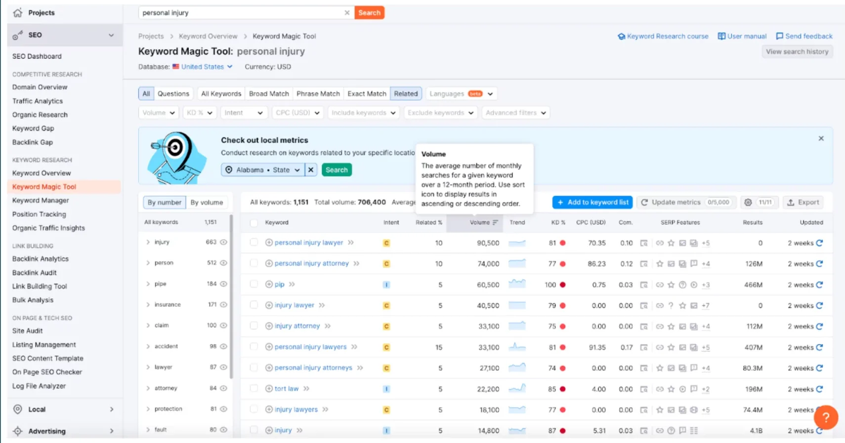 We start by analyzing keyword difficulty (KD) — a metric that estimates how hard it is to rank for a given term in search results. By combining KD with search volume, we’re able to prioritize the right mix of keywords that are both attainable and valuable for your law firm.